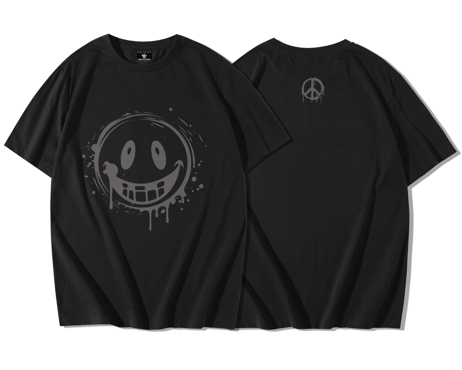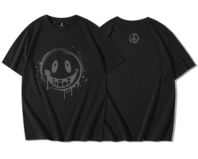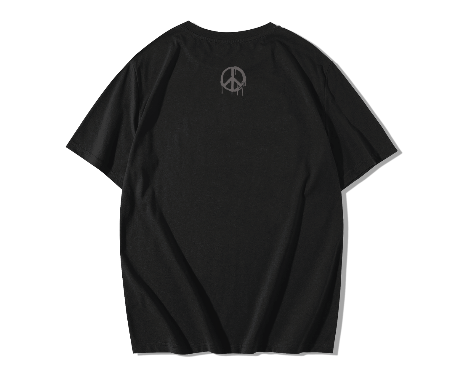 À l’avant, une expression iconique revisitée en version grunge / drip. À l’arrière, un symbole de paix minimaliste qui équilibre le chaos visuel par un message fort.