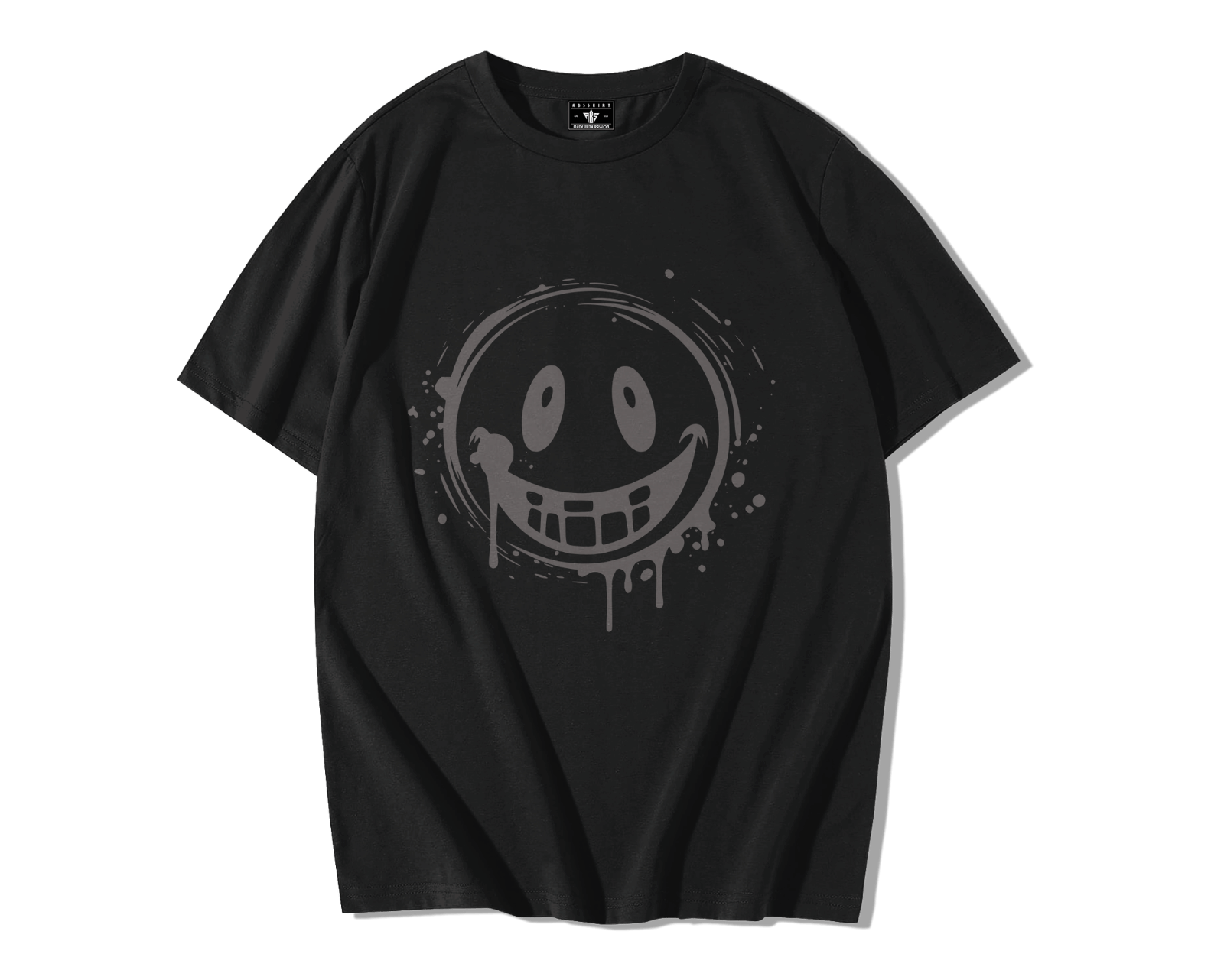 Le smiley, popularisé dans les années 90 par la scène électronique et rave, représentait à l’origine une énergie positive, libre et collective. Ici, il est revisité avec un effet dégoulinant (drip), symbole de distorsion, de chaos et d’émotion brute.