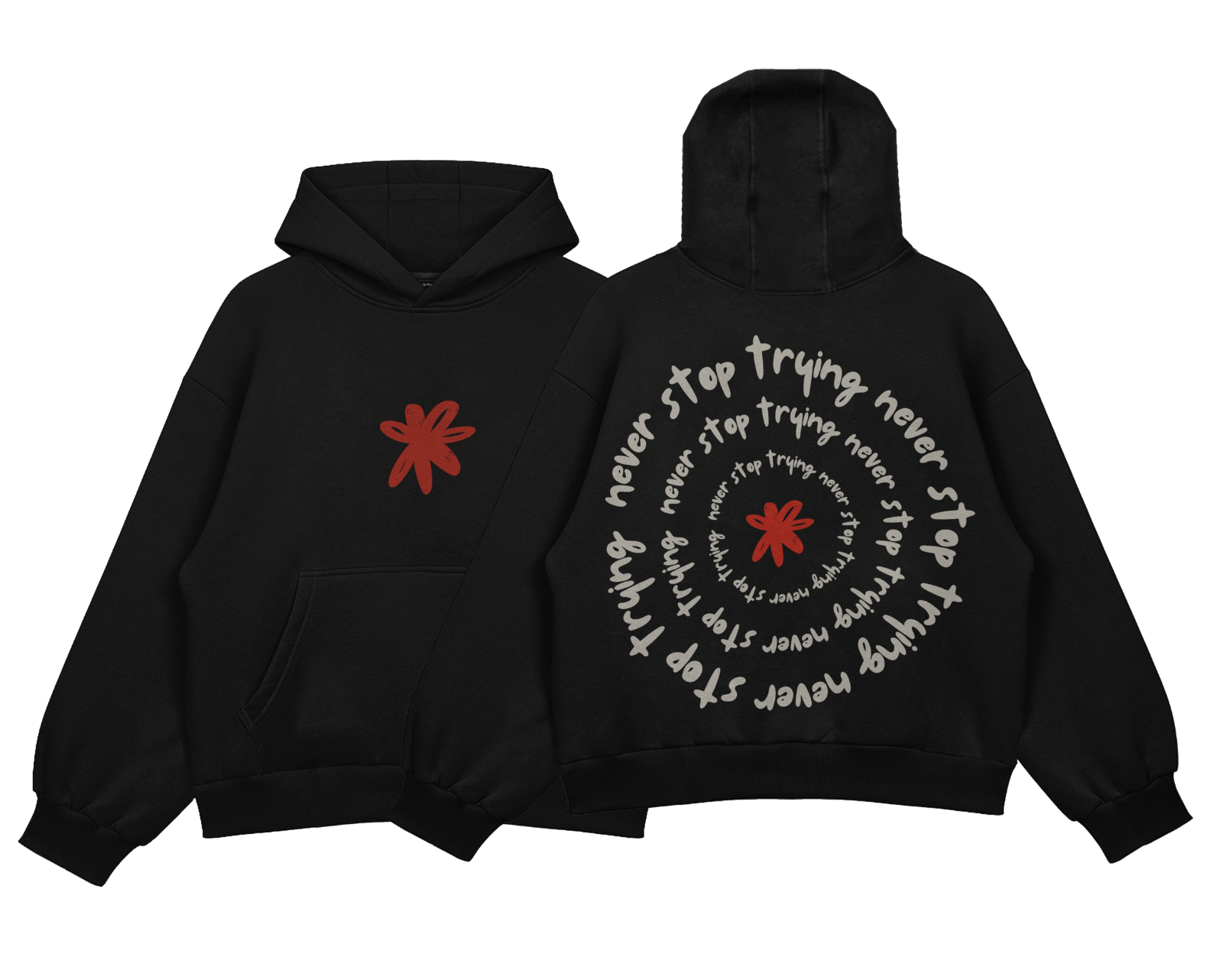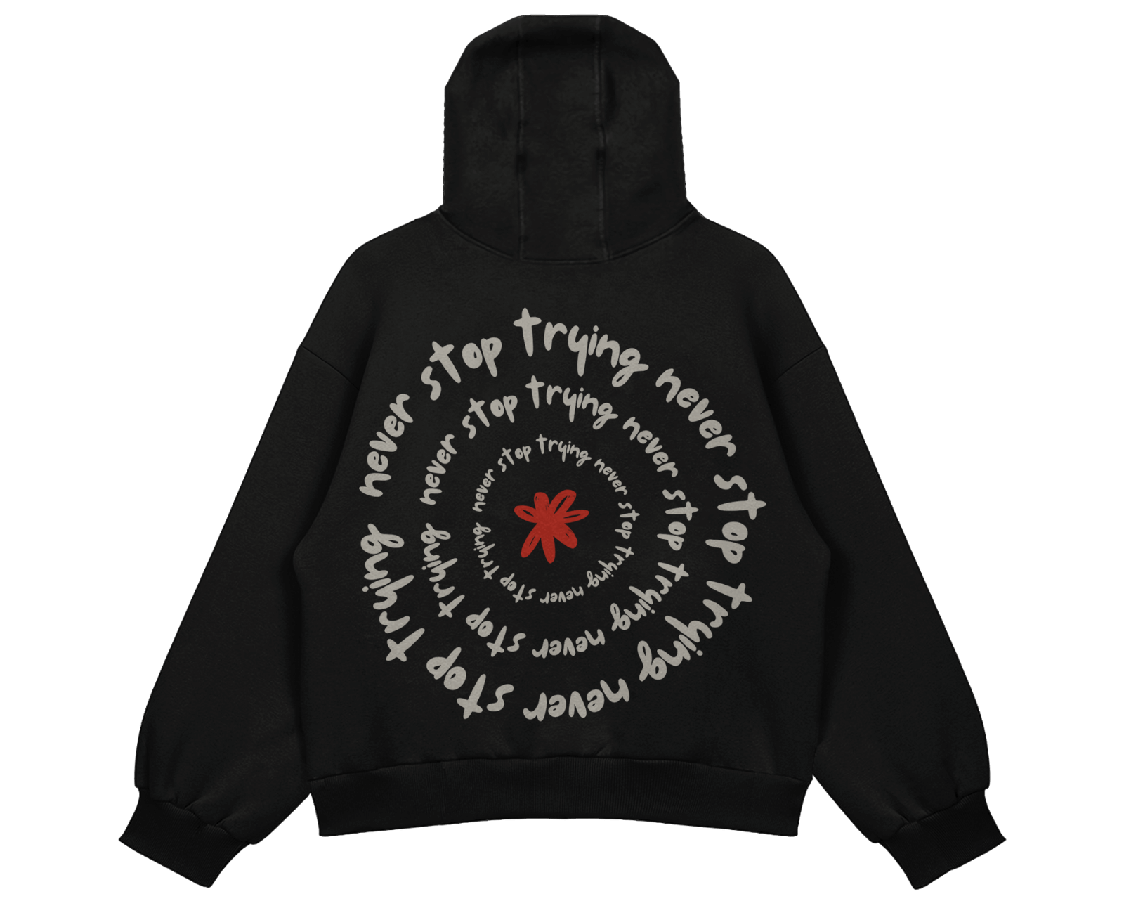 Au dos, le message NEVER STOP TRYING se répète en cercle,