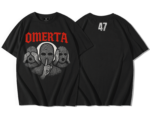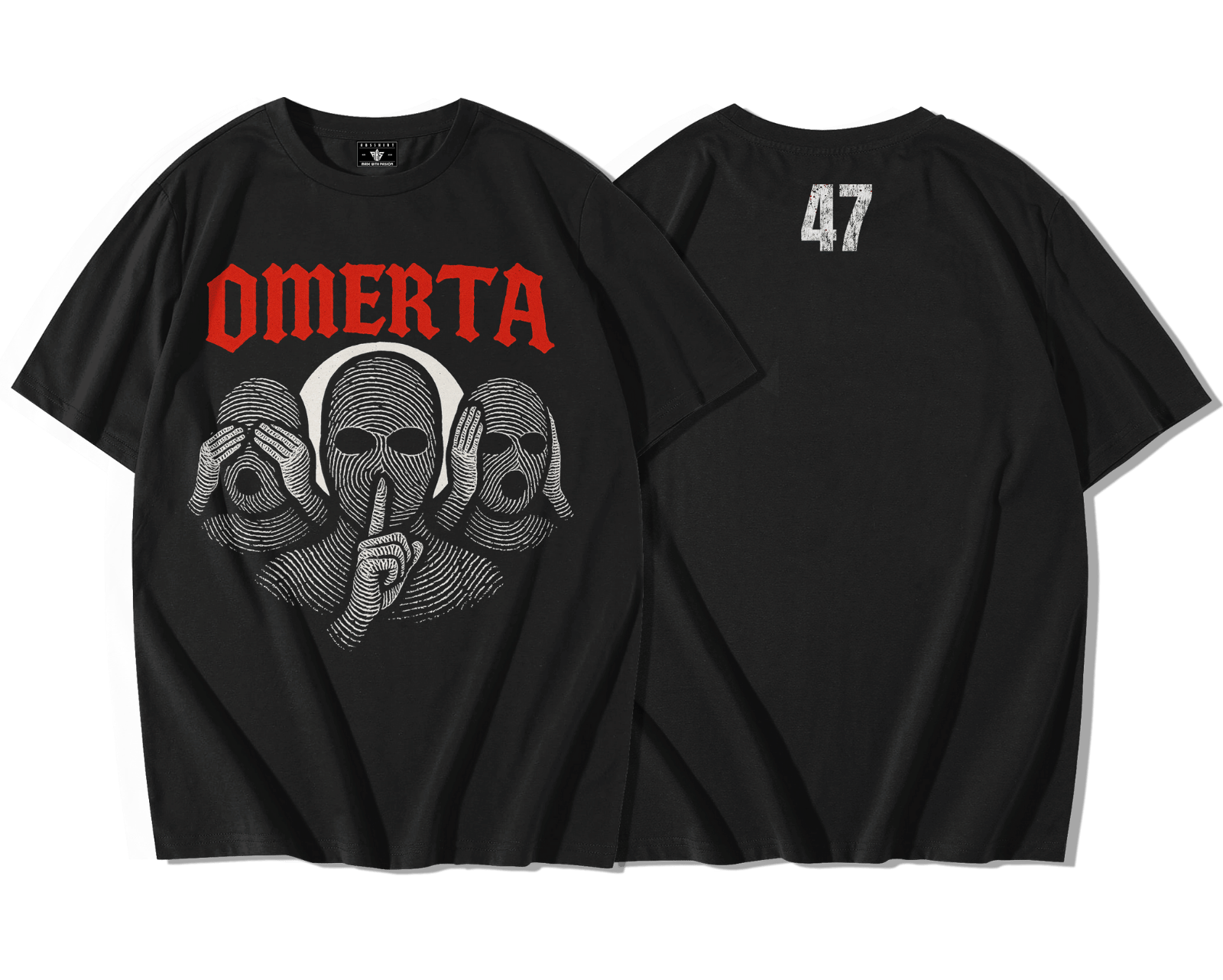 Porter le Bloodprint Oversize Tee, c’est revendiquer une mentalité. Le code OMERTA ne parle pas, il agit. Ce t-shirt oversize traduit cette philosophie : l’élégance du calme, la dignité dans le silence, la loyauté avant tout. Chaque détail — du rouge symbolique au graphisme des trois visages masqués — rappelle la maîtrise de soi, la discrétion et le respect des valeurs fortes.