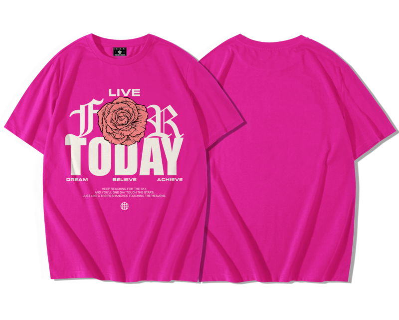 Bloom Today Oversize Tee est un t-shirt oversize premium pensé pour le streetwear et l’expression personnelle. Conçu en 100 % coton 200 g/m², il allie confort, résistance et une identité graphique qui attire l’œil. Son design rose centrale éclatante entourée de typographies massives “Live For Today” symbolise la force, la passion et l’instant présent.