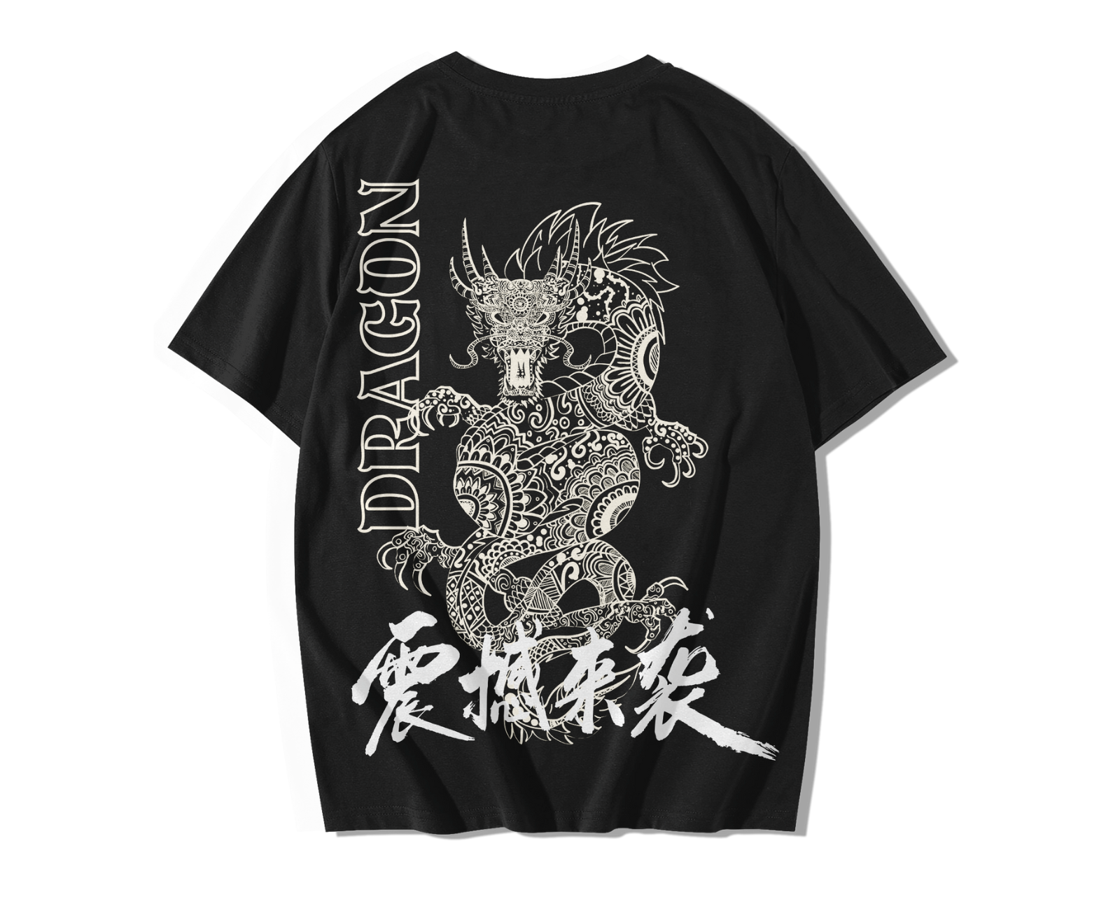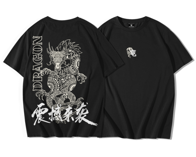 Le visuel de Dragon Reign Oversize Tee met en scène un dragon blanc richement texturé qui serpente en position de garde. Les écailles dessinées en motifs répétitifs, la crinière effilée et les griffes tendues traduisent une tension maîtrisée : l’instant où la puissance se concentre avant l’action. À gauche, le lettrage vertical DRAGON agit comme une colonne vertébrale graphique ; en bas, des traits calligraphiques nerveux signent le mouvement et l’impulsion.