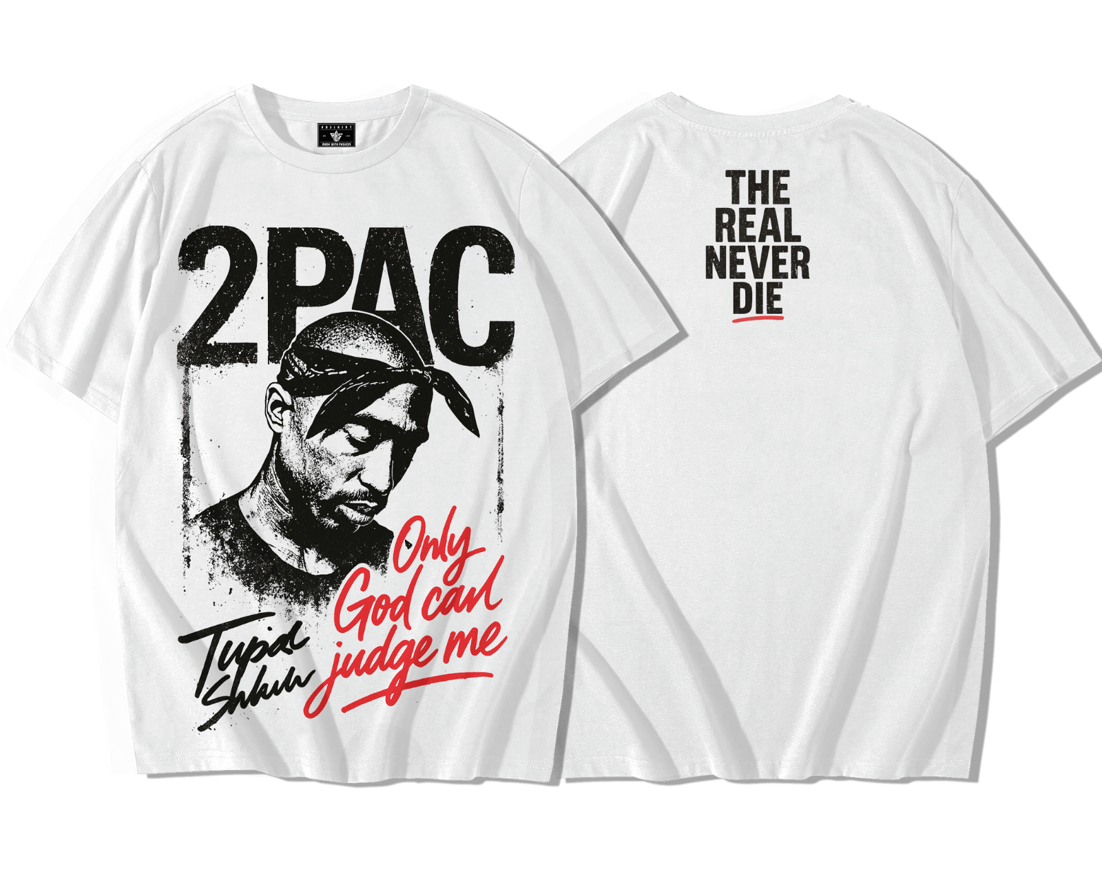 Chaque détail du design raconte une émotion : le portrait de 2PAC, grave et déterminé, exprime la douleur, la lutte et la foi. Les mots “Only God Can Judge Me” rappellent l’un de ses messages les plus puissants — un appel à la dignité et à la vérité personnelle. À l’arrière, la phrase “The Real Never Die” résume toute son héritage : la sincérité ne meurt jamais, la vérité survit au temps.