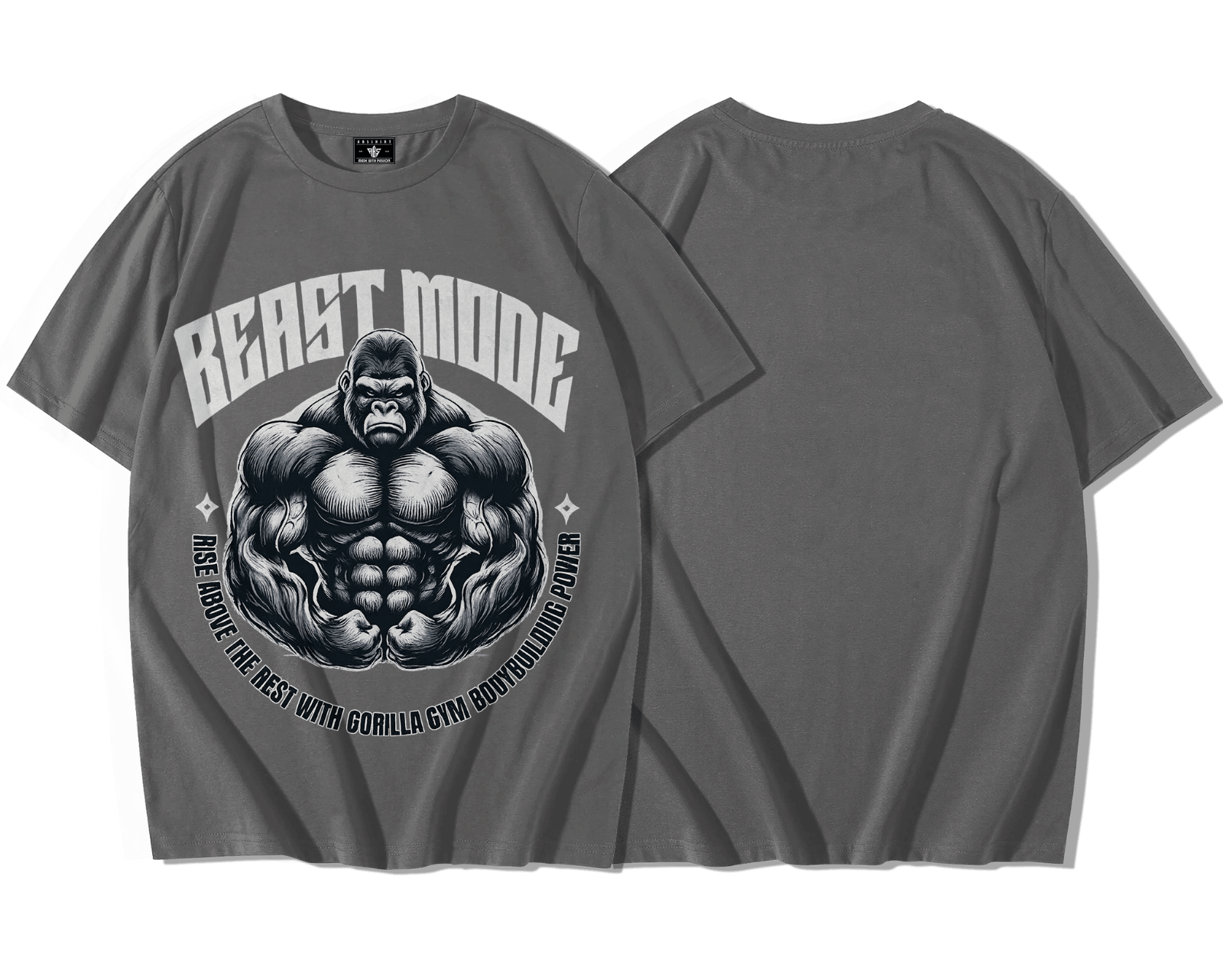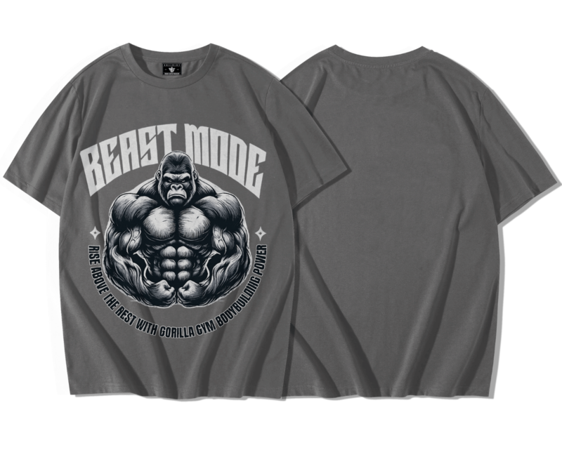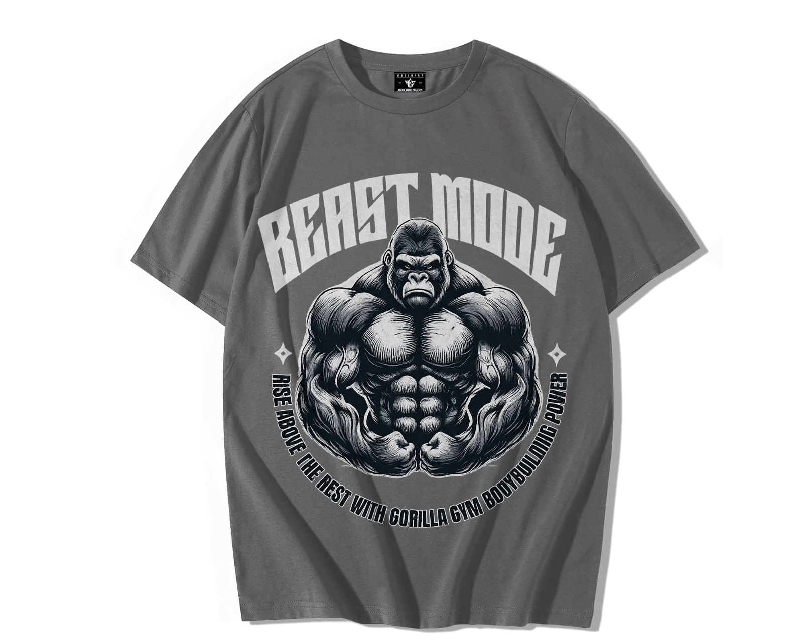 La typographie massive de “BEAST MODE” renforce le message : entre rigueur et rage contenue, chaque entraînement devient un combat personnel. La mention “Rise Above The Rest – Gorilla Gym Bodybuilding Power” illustre l’essence du dépassement : dominer sa peur, ses limites et ses excuses.