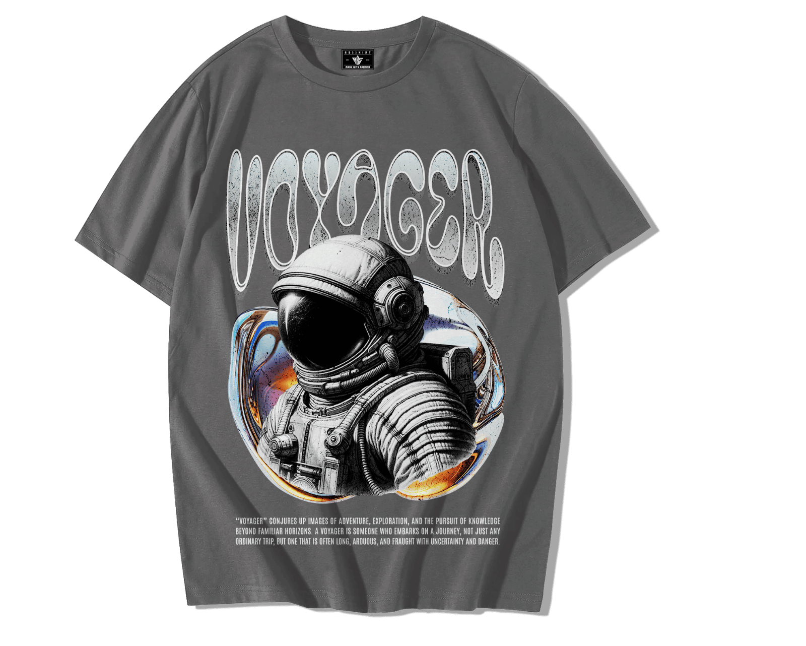 Ce t-shirt traduit cette vision dans une esthétique contemporaine : space streetwear — futuristic fashion — cosmic aesthetic — sci-fi clothing — astronaut graphic tee.